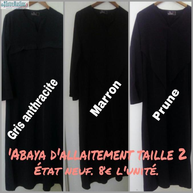 Abaya allaitement marque Al bassira taille 2. Couleurs gris anthracite, marron, prune. 2 modèles différents. État neuf .Me contacter pour plus de renseignements. 8 € l'unité.