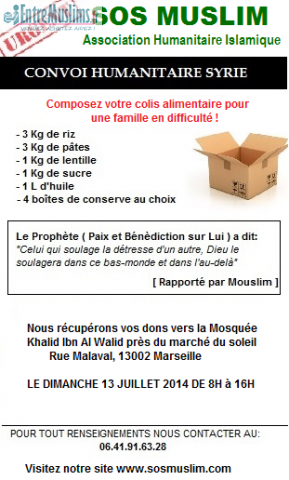 L'association SOS MUSLIM organise une collecte de colis alimentaire pour la Syrie DIMANCHE 13 JUILLET 2014 de 8h à 16h vers la Mosquée Khaled Ibn Al Walid près du marché du soleil. (Rue Malaval 13002 MARSEILLE)