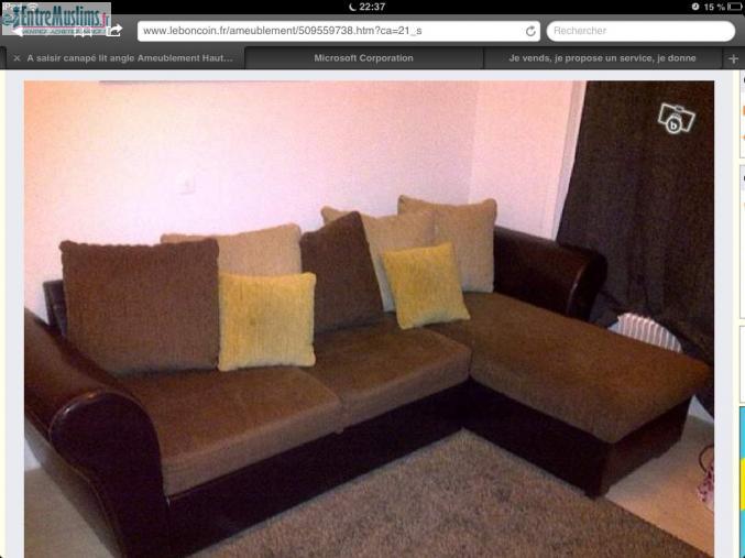 Salam aleykoum je vend mon canapé d'angle en tissu très confortables peut servi et quasi neuf avenir chercher sur place