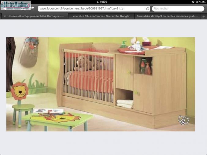 Salam aleykoum je vend cause de départ se lit bébé très partique qui suit l'évolution de bébé par contre je n'ai pas l'armoire comme ces montrer dans la photo faut l'acheter a part ces un lit bébé avec sa tablé à langer coller avec des étagère derrière la table a langer quasi neuf
