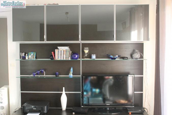 grand meuble TV de salon de couleur wengé 2,30 mètres de haut et 2.40 mètres de large,