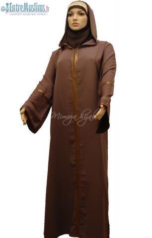 Je vends cette Djellaba, coupe évasée et manches en cône, finitions satinées au niveau du coude, de la manche, de la capuche et le long de la robe. Tissus caviary très fin de haut de gamme, fermture éclaire au niveau du col sur 15 cm env.