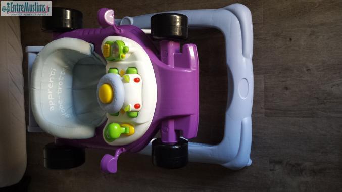 Trotteur neuf "Apprenti globe-trotteur" couleur aubergine , de la gamme "babybus" avec assise confortable multipositions, tablette de jeux amovible et roues avant pivotante, patins d'adhérence.