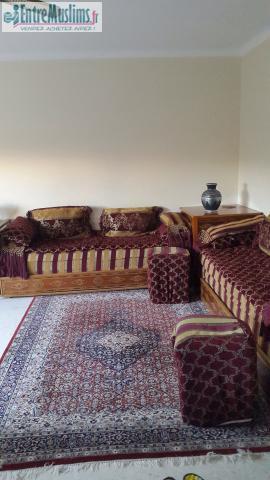 A vendre d'urgence un salon marocain en bon état , composė de 2canapes avec matelas en mousse standard (2 m), un coffre, des lhayefs 2 poufs et les housses pour coussins et matelas.
