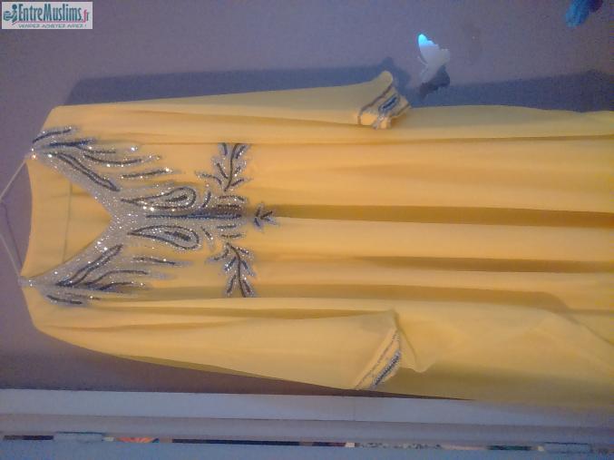 Vebd 2 robes de dubai. La jaune est neuve taille unique. La vert émeraude a ete porté 1 fois seulement et convient aux personnes petites de taille 1m 50 55 car la couturière la coupé trop courte pour moi, sinon elle est nickel aucun strass qui manque. L'envoie des robe est possible a vos frais bien sûr. 70 euros l'unité. Merci
