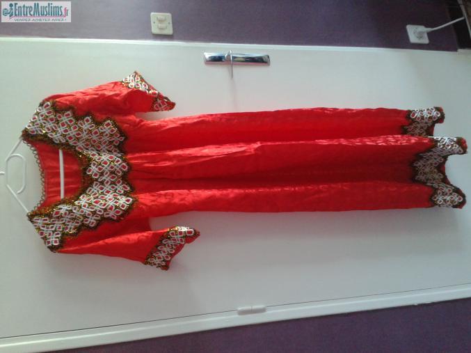 Je vends une très belle robe traditionnelle kabyle de couleur rouge avec broderies, tissu satiné, peut convenir a une femme taille36/38 ou ado 16/18ans... (arrive aux chevilles pour une taille de 1m60)