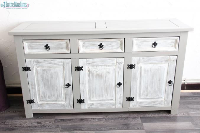 Un buffet 3 portes et 3 tiroirs couleur gris taupe patiné blanc PRIX 200€