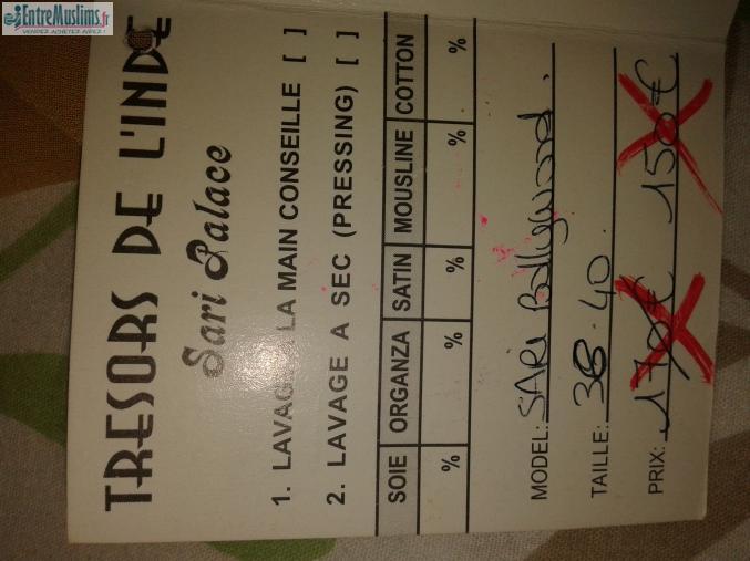vend sari neuf taille 3840. acheter 100e vendu 45e avec bracelet assortie et blindis. photo sur demande. a porter uniquement devant femmes et maharim, baraka Llahu fikounna
