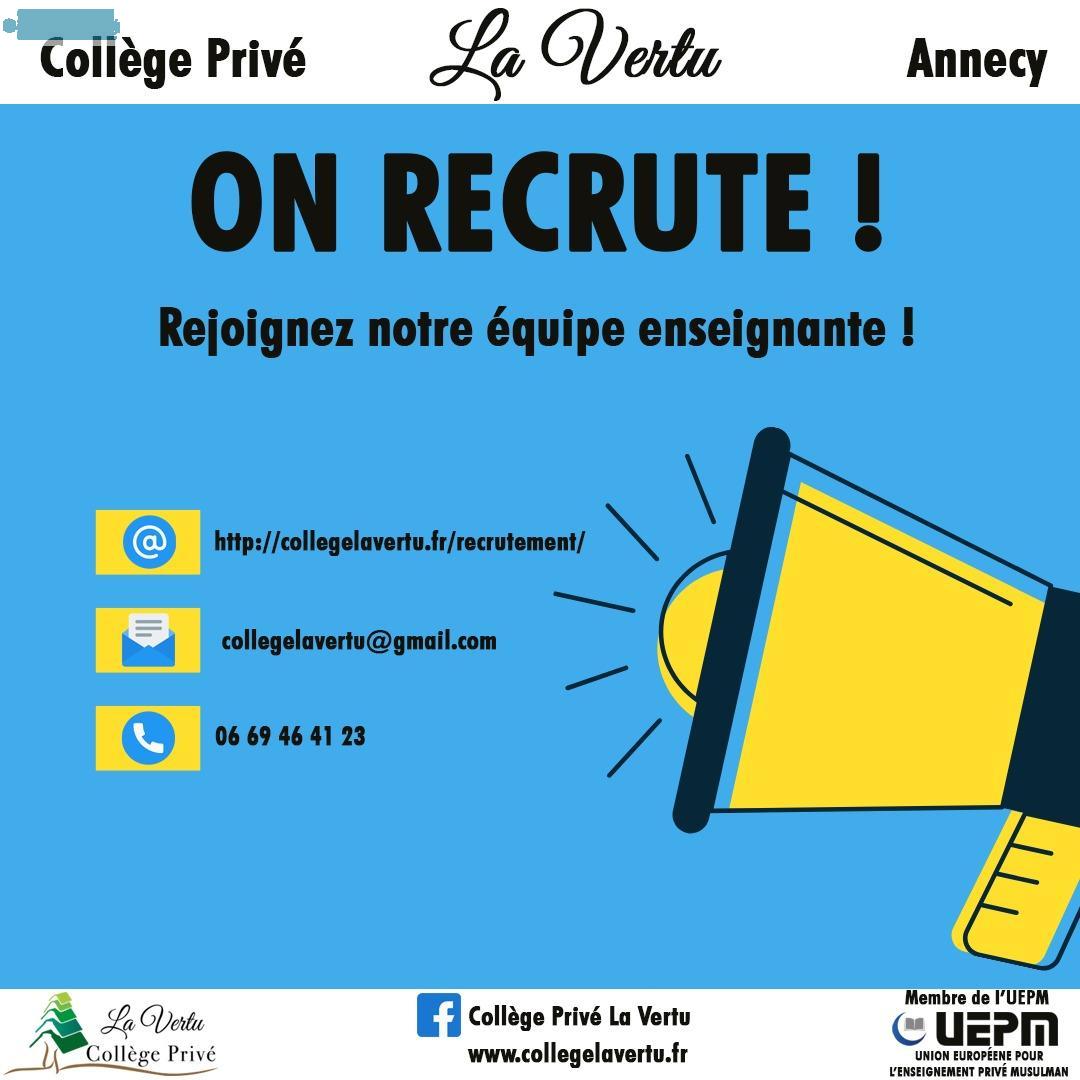 Recrute professeurs toutes matières pour ouverture d'un collège privé musulman au mois de septembre .