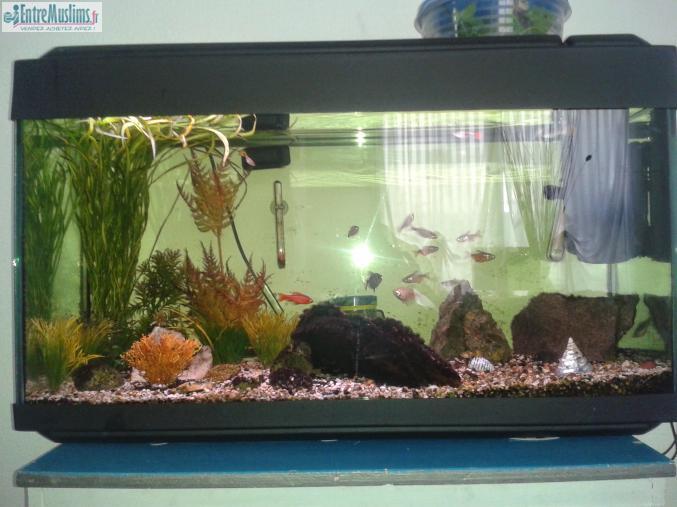 je vends et aquarieum 110L avec filtre et néon, chauffage et thermomètre, recharge filtre+ matériel de nettoyage+ décor à 70 euro non négociable, les poissons et la nourriture sont offerts