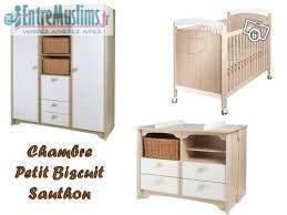 Elle se compose d'une grande armoire, un grand lit en 140 cm (se transforme comme sur la photo), une commode avec plan à langer, et un coffre à jouet.
