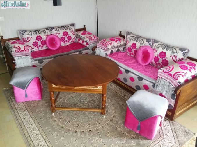 Je vends ce salon marocain composés de 2 banquettes matelas, tissus, sur matelas, coussins, table et poufs. Assez urgent déménagement. Je céde ce jolie salon a 600€