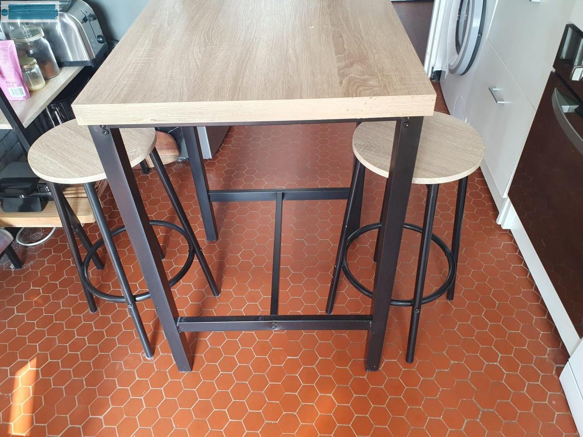 A vendre table haute de cuisine avec ses 2 tabourets, l'ensemble à 50€ à débattre.