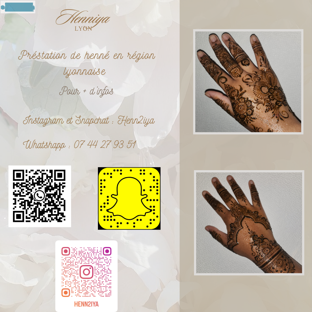 Salam aleykoum je propose des prestations de henné entre 7 et 12 euros suivant le modèle en région lyonnaise. Mes prestations sont faites avec du henné naturelle contenant des huiles essentielles donc déconseillés aux femmes enceintes.