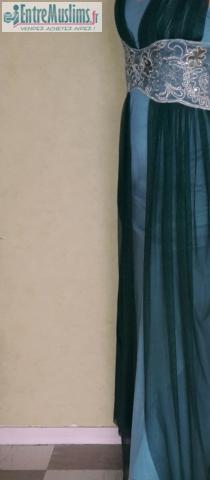 Je mets en vente ce beau "caftan" (type robe de soirée) composé d'une doublure ainsi qu'un voile recouvrant la robe et ouvert au centre,fermeture éclaire sur le coté .