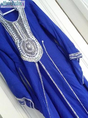 Je vends cette magnifique robe de Dubai couleur bleu roi avec ornements argentés.